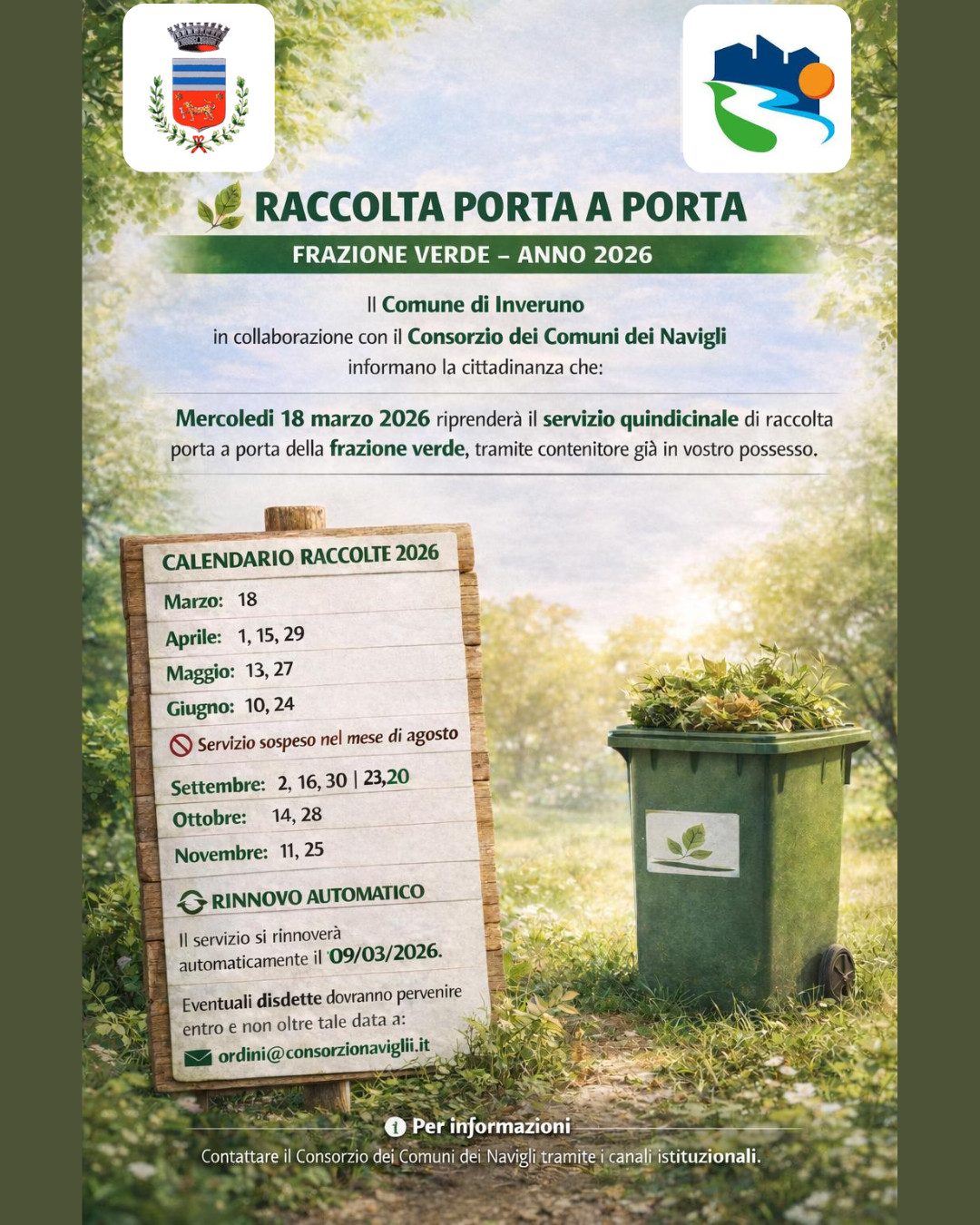 Mercoledì 18/03/2026 riprenderà il servizio, quindicinale, di raccolta porta a porta della frazione verde tramite contenitore già in vostro possesso.