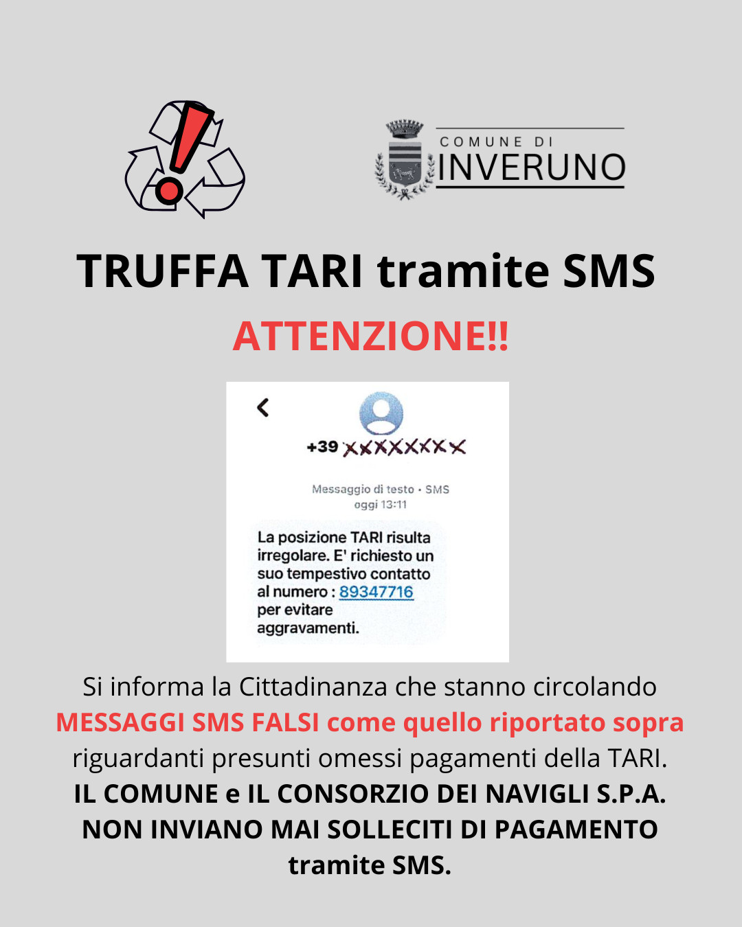 Si informa la Cittadinanza che stanno circolando MESSAGGI SMS FALSI riguardanti presunti omessi pagamenti della TARI.